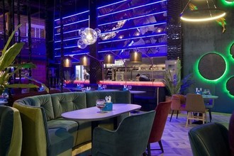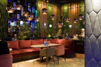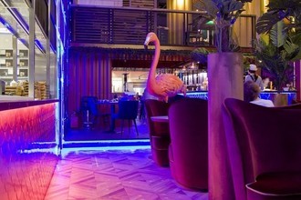 Стиль владельцев улавливается и в логотипе, и во внутреннем оформлении, и в меню. Вход в виде лодки выглядит достаточно сдержанно и не привлекает особого внимания, а вот интерьер поражает воображение. Кажется, что он соединил в себе все основные ассоциации связанные с отдыхом, реками, морями и океанами. Здесь есть композиция в виде джунглей с настоящим водопадом, есть причал с диванами в форме лодок и даже несколько настоящих морских контейнеров. Но особенно полюбился гостям заведения сад фламинго. В этой части ресторана стоит сразу несколько больших фигур этих необычных птиц. Помещение ресторана рассчитано на 170 посадочных мест.